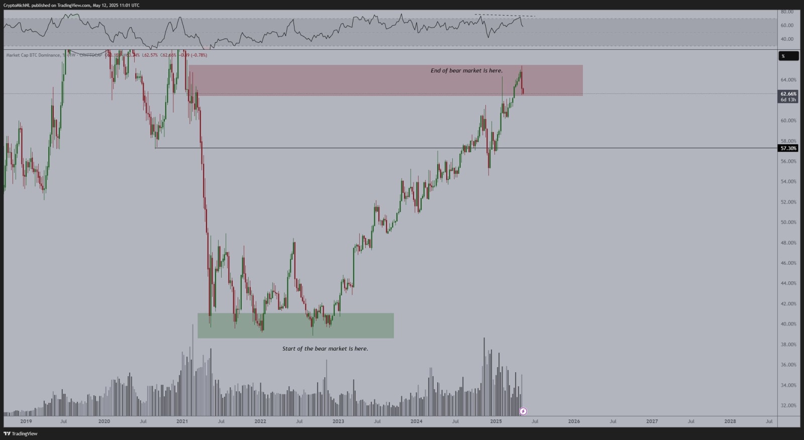 Significant bearish divergence observed on the weekly chart suggests that Bitcoin’s dominance may have reached its peak. This could mark the conclusion of the bear market phase for altcoins.