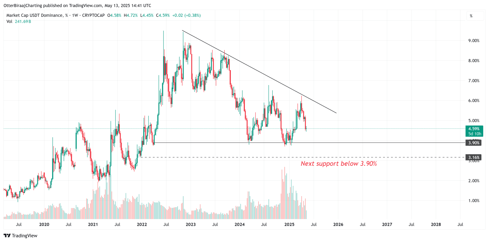 The dominance chart for this asset has fallen to its lowest point since early February, reaching 4.59% on May 13. As shown below, the USDT.D chart might find support around 3.90%, displaying a descending triangle formation. If there’s a bearish breakout from this pattern, it could result in new lows not seen since 2021, aligning with past altseason levels.