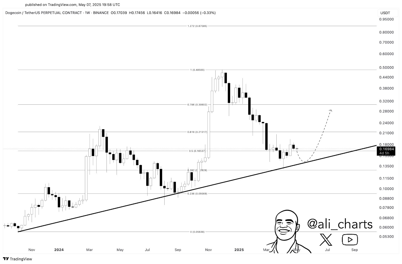 The technical analysis for DOGE indicates that the current trend may continue. Recently, Ali Martinez noted that the Dogecoin price experienced a sharp rejection after hitting an October 2024 trendline support level. Based on this insight, he believes that dipping down to around $0.14 might offer a good chance to buy before potentially bouncing back up towards $0.30.