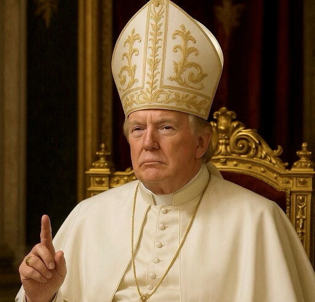The image showed the US president clothed in white garments, adorned with a gold cross around their neck and a mitre hat on their head, as they pointed upward with their right forefinger towards the heavens.