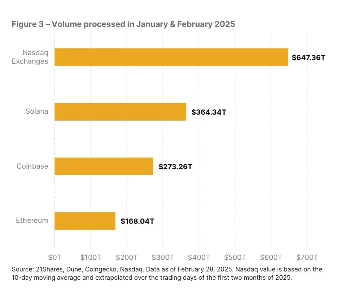 In January and February 2025, Solana handled a transaction volume of $364.34 billion, placing it above both Coinbase and Ethereum. The only platform leading this metric was Nasdaq, which reached $647.36 billion.