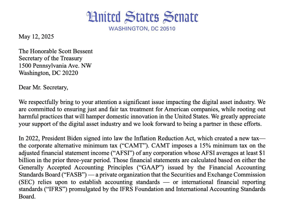Two U.S. senators are urging Treasury Secretary Scott Bessent to “use the department’s power” to modify a regulation concerning taxes on corporations’ digital asset holdings.